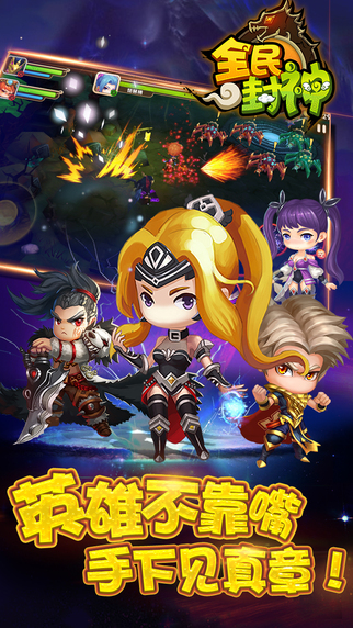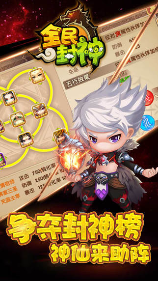 《全民封神》是一款创新地将策略、RPG与卡牌元素完美融合的手游。《全民封神》采用Q版画风,游戏画面整体俏皮可爱,中国风的仙界场景美轮美奂,进行游戏的同时,仿佛置身于仙境之中。独特的五行属性策略战系统,让玩家们感受最新颖的卡牌玩法。